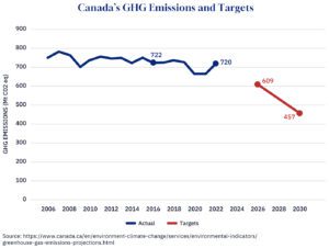 However, the previous government’s approach, which relied on onerous regulations and taxes, as well as expensive subsidies, has imposed significant costs on Canadians. It has also provoked a bitter jurisdictional conflict with the provinces. Furthermore, the policies have not led to a meaningful reduction in emissions. As the chart below illustrates, emissions are little changed since 2016 and are well above the 2026 and 2030 interim targets. The commissioner of the Environment and Sustainable Development has been very clear that Canada is not on track to meet these targets.
