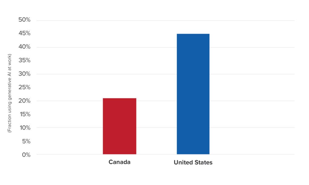 Yet in Canada, only about one in five workers are using these tools. The United States, in contrast, has already moved into a second wave of adoption, with nearly one in two professionals integrating GenAI into their workflows. This gap is not merely academic. It represents a widening productivity chasm that could compound over time, as American workers become vastly more efficient than their Canadian counterparts.