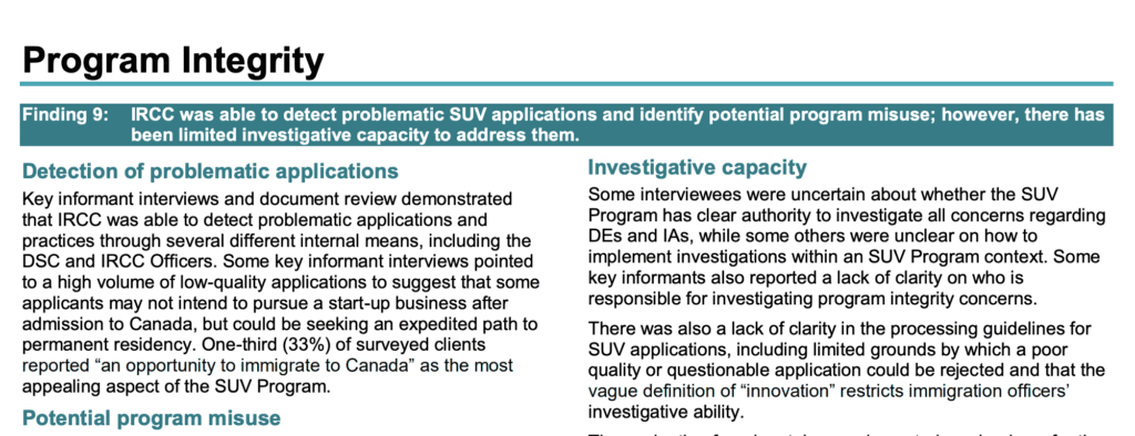 The report pointed to several concerning patterns: “Many key informant interviews and internal integrity exercises have observed some instances of potential misuse of the SUV Program by some DEs, including charging applicants for assessing the business, submitting documents to IRCC, and accessing IRCC services; submitting fraudulent applications; falsifying or reusing documents and business plans; subcontracting due diligence responsibilities to external stakeholders; and conflicts of interest in business ownership and investment. In addition, some key informant interviews and internal integrity exercises observed program misuse by immigration lawyers and consultants, such as selling SUV business plans and submitting fraudulent documents.”