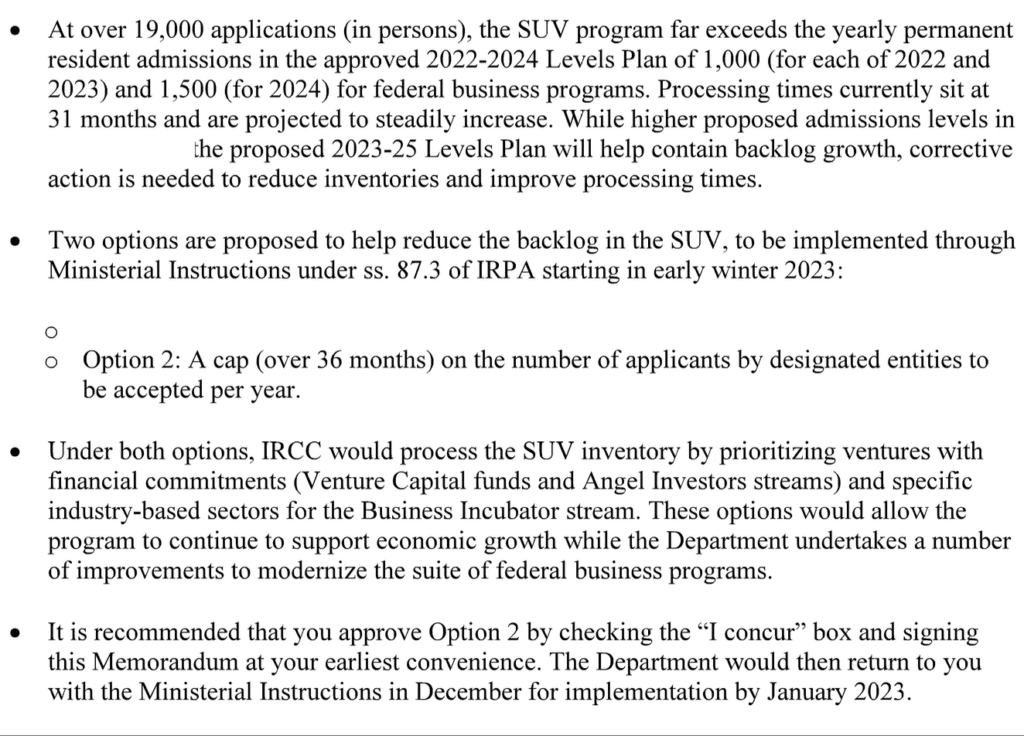 In 2022, the government began acknowledging the strain being put on the program. An internal memorandum (ATIP A-2024-69816) sent to Immigration Minister Sean Fraser on November 14, 2022, reported an inventory of more than 19,000 Start-Up Visa applicants. Despite the higher projected annual admission targets at the time (5,000–6,000 spots), processing times had reached 31 months and were expected to keep rising. Deputy Minister Christiane Fox warned that Canada was struggling to compete with peer countries. Comparable programs in the United Kingdom processed applications in about 8 weeks, while Australia typically took 6 to 8 months.
