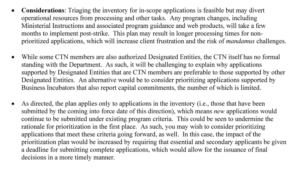 The introduction of “priority processing” in June 2023 effectively created a two-tier system. Applications connected to CTN vaulted to the front of the line, moving ahead regardless of their actual investment, job creation potential, or business progress. Internal memos reveal Deputy Minister Fox cautioned against this, proposing that IRCC not prioritize applicants based on membership in an external network the department did not control (see Figure 6). Because this advice was ignored, a founder who raised substantial capital could still face extreme delays simply because their incubator was outside the government-favored network.