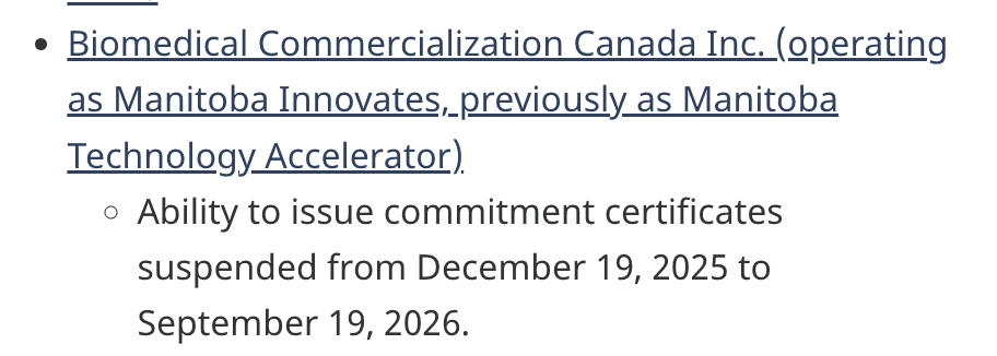 Another designated organization emerged as a major contributor to application volumes. Biomedical Commercialization Canada Inc. (which participated in the Start-Up Visa program under multiple operating names, including Manitoba Technology Accelerator (MTA) and later, Manitoba Innovates), had its designation suspended by IRCC on December 19, 2025, preventing it from supporting new applications for nine months.