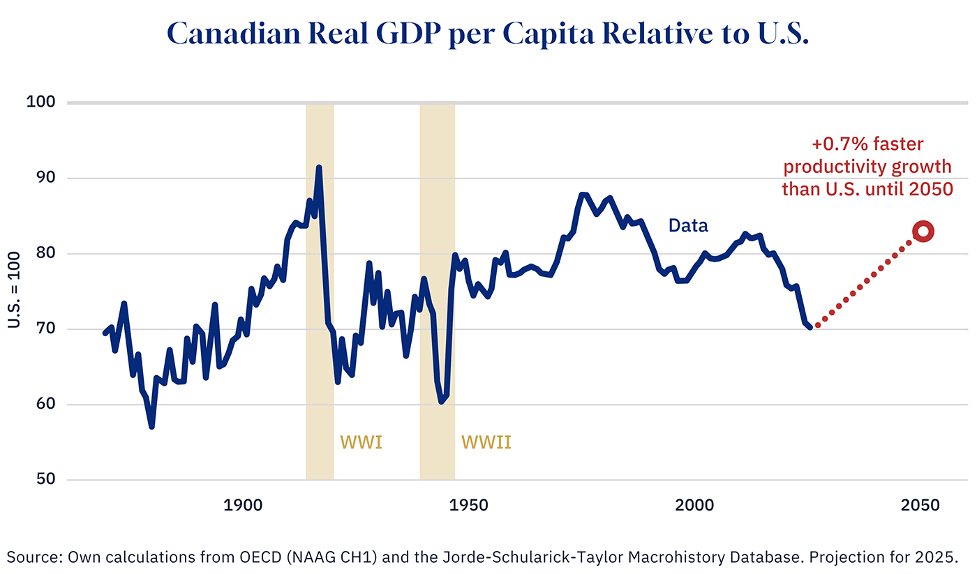 Over the past decade, Canada’s labour productivity growth has fallen well behind the U.S. and other advanced economies. Had we simply kept pace with our earlier trajectory, Canada’s economy today would be roughly 20 percent larger—that’s well over $600 billion in foregone annual income. That gap dwarfs the estimated impact of even a severe trade war.