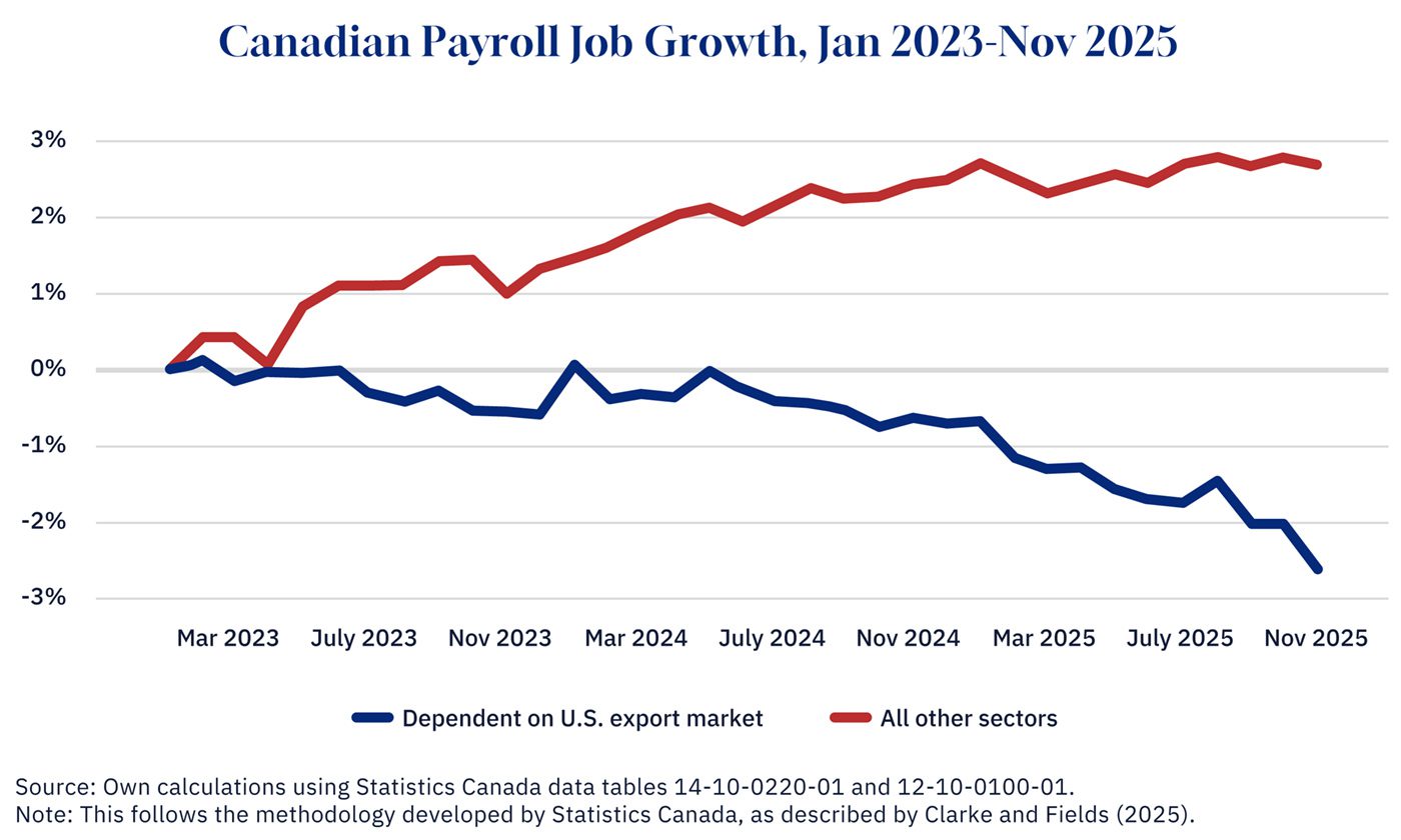 Had payroll employment in U.S.-dependent sectors grown at the same pace as the rest of the economy, I estimate total employment in Canada would be nearly 91,000 jobs higher as of November.