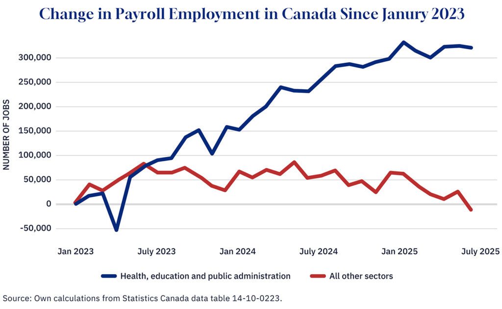 Even among sectors that are growing, the gains are narrowly concentrated. Over the past two and a half years, all net job growth has come from health care, education, and public administration. These sectors have added over 300,000 jobs. But outside of them, jobs are down 75,000 this year alone.