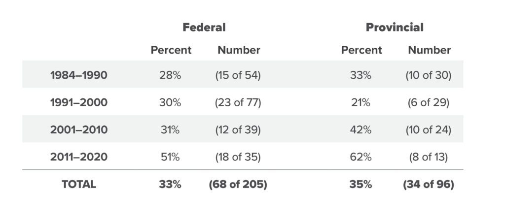 The above data show that, from 2011 to 2020, Canada has been far closer to Scenario 2 than Scenario 1. This has resulted in a net institutional loss for both provincial and federal legislatures, but a far greater jurisdictional loss for provincial legislatures.
