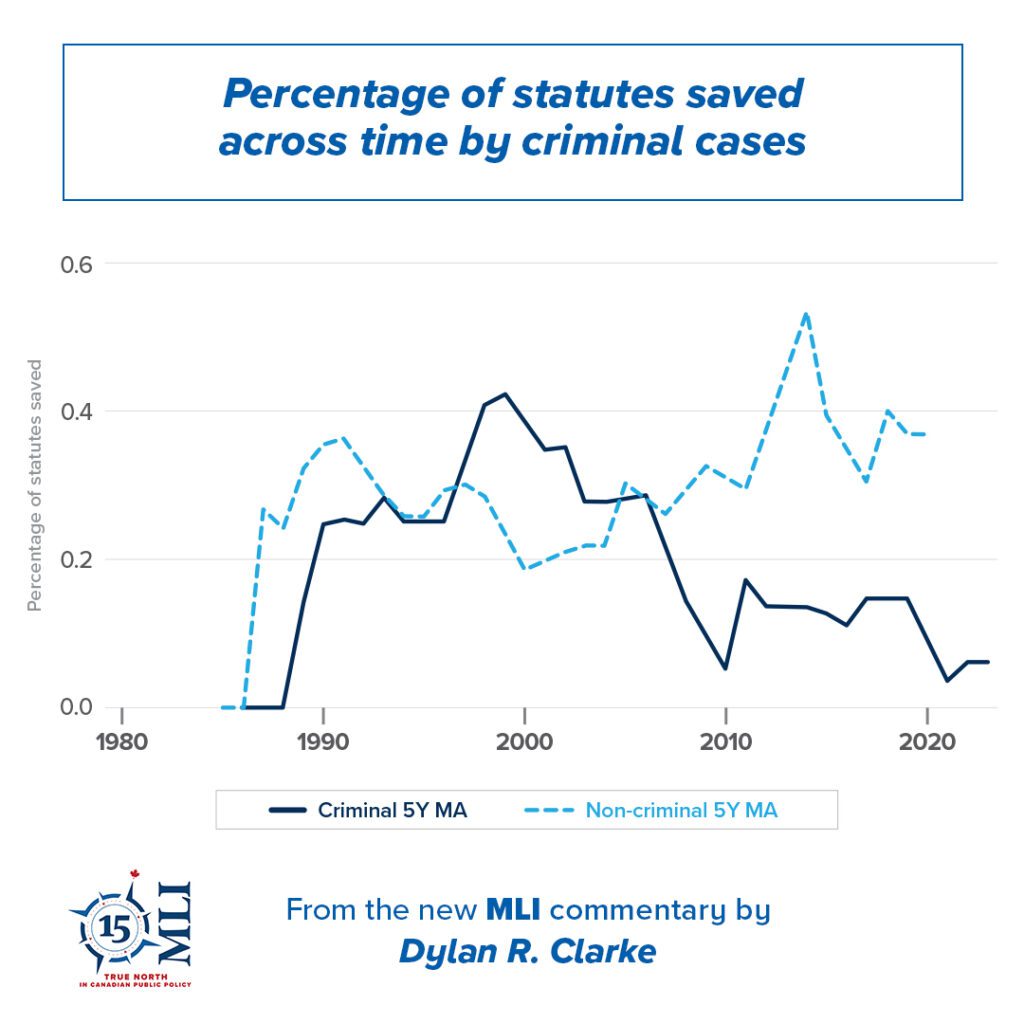 The Court points to sections 7 to 14 of the Charter as examples of where this approach shows up. Indeed, nearly half of all criminal laws challenged under section 7 – which protects life, liberty, and security of person – are struck down. And when the SCC finds a law that violates section 7’s “principles of fundamental justice,” it has never upheld that law in a majority decision.