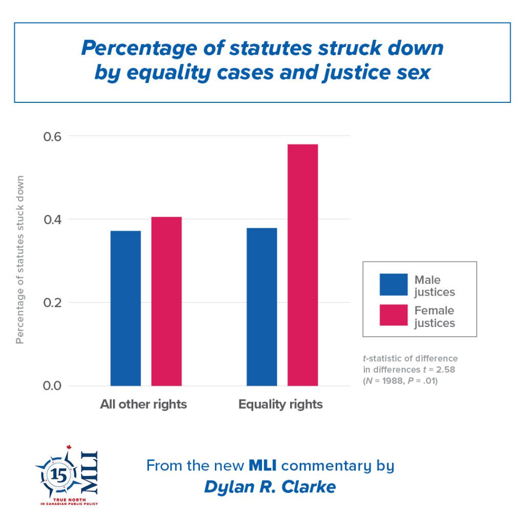 Justice politics in criminal law is not the lone instance of legal realism, or “personality-based decision-making,” on the Court. Figure 4 displays the invalidation rate of statutes across equality rights by justice sex. Female justices are more likely to strike down statutes that purportedly violate the right to equality. This suggests that democratic deference and party politics is hardly only a feature of partisan politics but rather judge preferences. This could be due to differences in judicial philosophy, judicial biography, or judge preferences, but has not changed over time as the test for equality has evolved. The attitudinal model of judging suggests that justices’ decisions are influenced by their personal values and ideological orientations – here, potentially reflecting a greater sensitivity among female justices to issues of equality and discrimination. Rather than matters of right or wrong, ideology and personality may drive judicial decision-making at the apex court more than one might think.