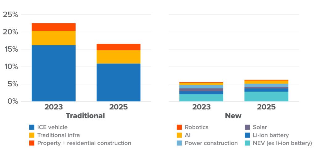 Figure 1: Estimated upstream and downstream economic output of traditional and “new” industrial sectors, 2023 and 2025