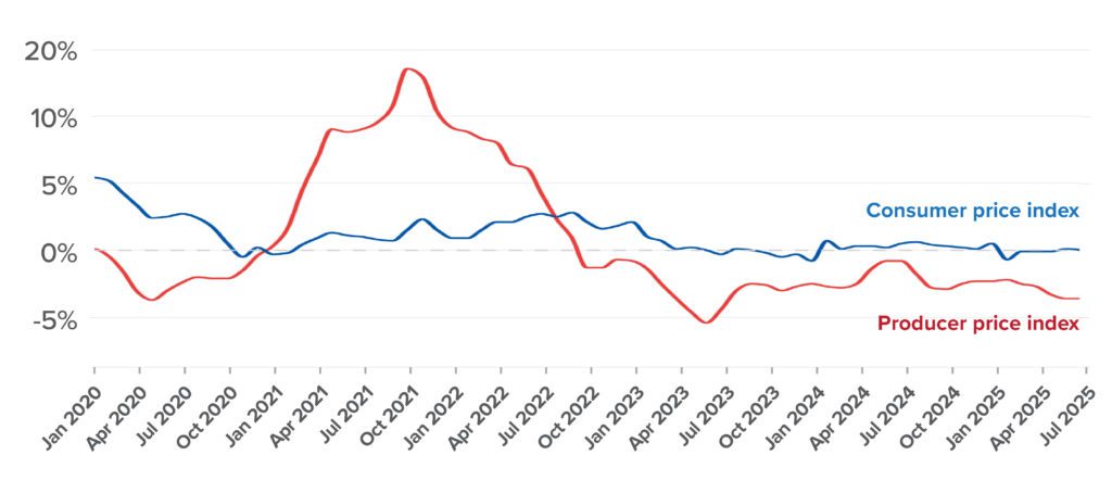 Figure 2: China’s producer and consumer price indices (year over year change, 2020–25)