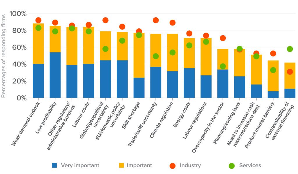 Reflecting Germany’s challenges, the broader European outlook remains subdued. Across Europe, aging populations, stagnant productivity, and inflexible labour market institutions constrain growth. Surveys of euro-area firms show expectations of near-stagnant business investment over the next three years, with many companies planning to expand outside the euro area rather than within it. Weak demand is cited by nearly nine out of ten firms as the principal constraint on investment, followed closely by low profitability, regulatory burdens, and labour costs (see Figure 5).