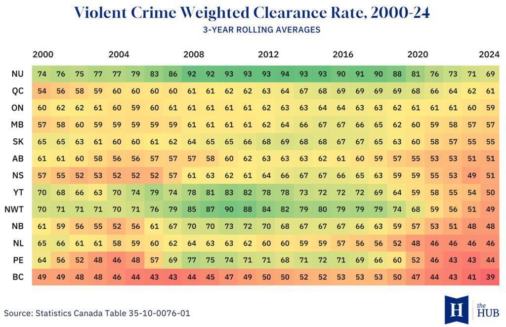 To measure provincial variation in clearance rates, the “heat map” below displays the violent weighted clearance rate for every province and territory during the same period (the highest rates are dark green, the lowest are dark red).