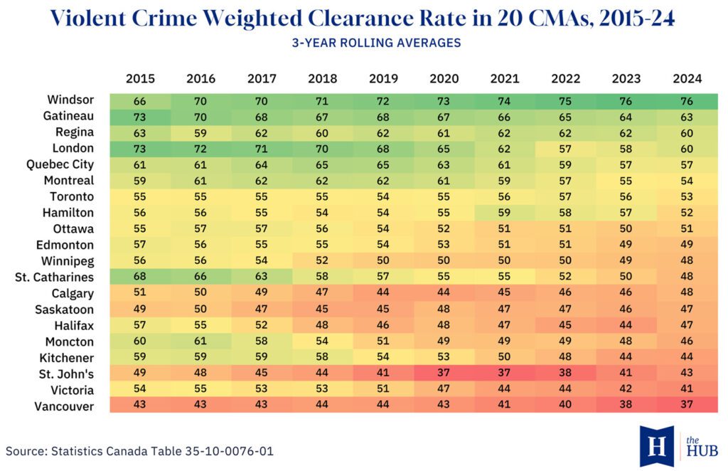 By contrast, violent clearance rates have declined more modestly in Toronto, Hamilton, Quebec City, Regina, Saskatoon, and Calgary. Windsor is the clear outlier, with its violent clearance rates steadily rising by nearly 10 percentage points over the last decade. Interestingly, Windsor’s rolling non-violent rate moved in the opposite direction, decreasing from 30 to 23 percent over this period.