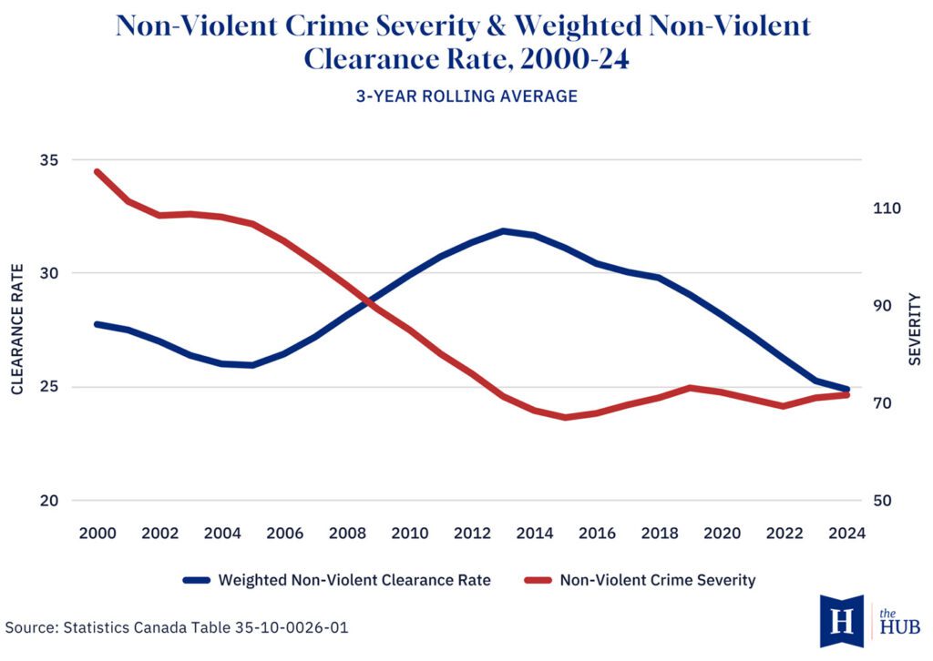While somewhat counterintuitive, it is worth remembering that all crimes are investigated within police services constrained by finite resources. As violent crime increases, those resources are inevitably pulled toward the most serious and urgent cases. Major investigations—especially homicides, shootings, and other high-priority violent incidents—can require large teams and stretch over long periods, drawing personnel away from property crime and non-violent incidents. In an era of rising violent crime, non-violent crimes receive less attention and resources, which can ultimately lead to lower clearance rates. Rising violent crime puts pressure on the entire system.