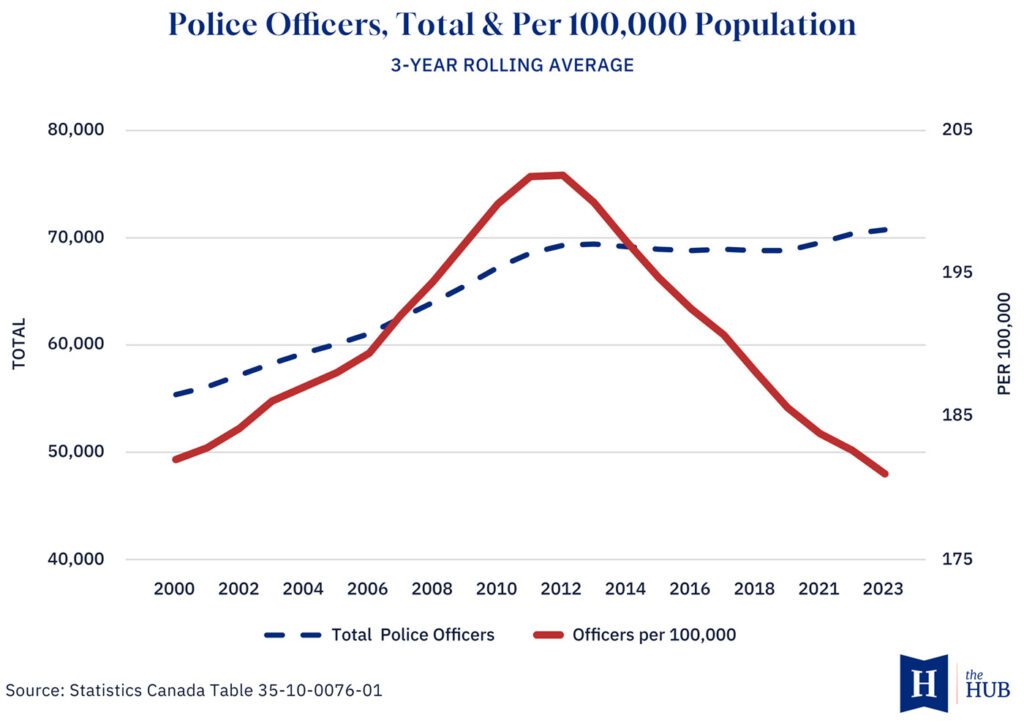 As Canada’s population skyrocketed from 35 million to 40 million people during the same period, this translated into a substantial per capita decline in police: between 2012 and 2023, the number of police officers per 100,000 people fell by roughly 10 percent, from 202 to 181.