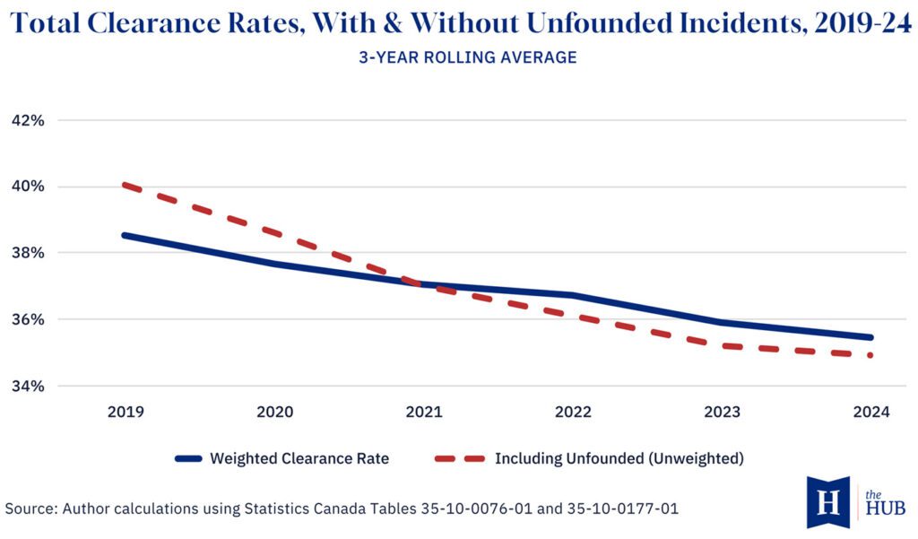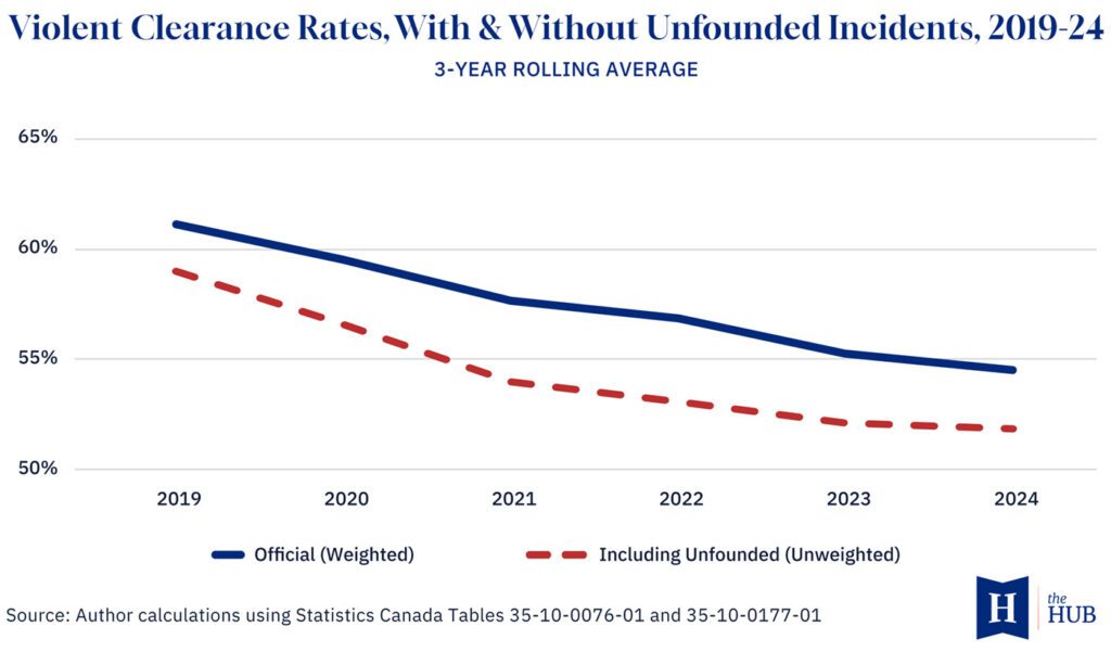 That is not what we see: even when accounting for Statistics Canada’s more inclusive definition of “founded” incidents, clearance rates have declined substantially since 2017. Crimes cleared as a proportion of all (founded and unfounded) criminal incidents dropped from 40 to 35 percent between 2017 and 2024, and from 59 to 52 percent for violent criminal incidents specifically.