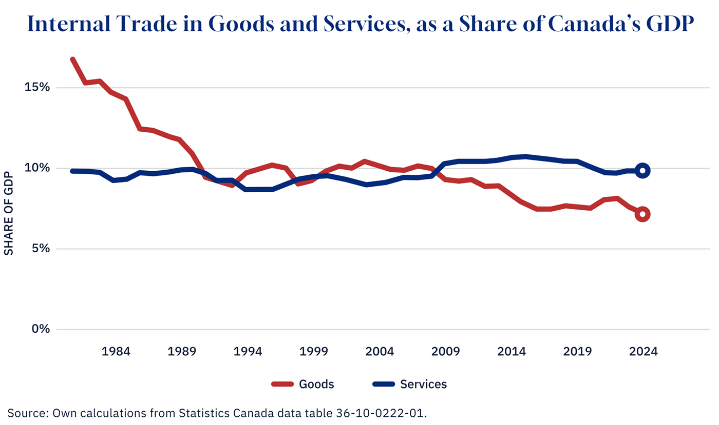 Canada’s lagging productivity adds urgency: Internal trade liberalization may be one of the more promising avenues for strengthening the economy and boosting future growth. And there’s certainly room to grow. Internal trade has reached the lowest share of Canada’s overall economy in decades.