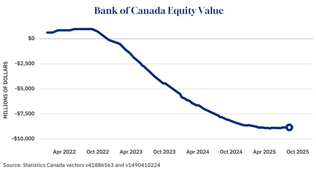 While the exact total remains unknown until the Bank’s financial statements are released later this year, recent data allows us to get close. The Bank’s equity position has shifted dramatically—from a peak of nearly $1 billion in the summer of 2022 to a negative value of nearly $9 billion by the end of June 2025, when it bottomed out. This implies cumulative losses of approximately $9.9 billion, which exceeds even the high-end estimate of our previous work.