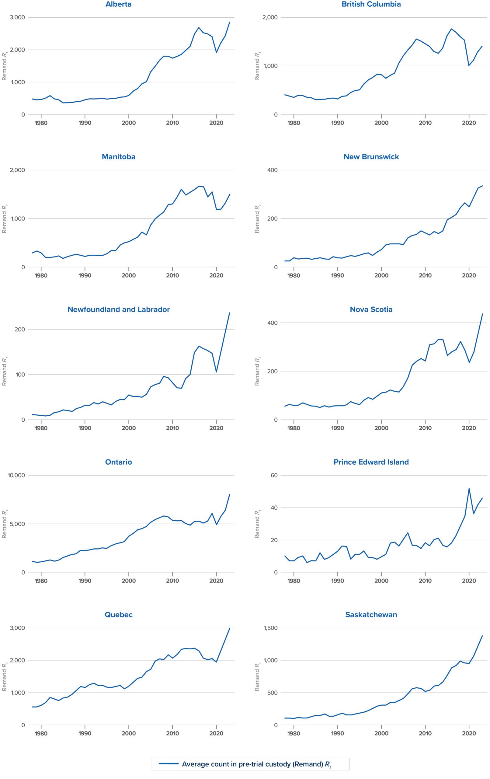Ten years into the post-Jordan era, the concurring opinion of Cromwell J. has rung true in arguing that “creating these types of ceilings is a task better left to legislation” (para. 147) and thereby “informed by facts” (para. 293). Little is known about the extent to which the Court’s framework in Jordan reined in the so-called “culture of complacency” or if the criminal justice system continues to spiral out of control. A formal empirical examination is clearly required. The data displayed in Figure 1 conveys a troubling trend for the population in pre-trial custody (remand) across many provinces from 1978 to 2024. Research conducted by Clarke and Metzler (2025) shows that court congestion is a major problem. Using queueing theory, the authors find that the criminal justice system appears to be spiralling out of control, and that court congestion can resolve the paradox of the secular rise of the population in pre-trial custody with falling crime rates. To be sure, there is a congestion problem that Jordan attempted to fix.