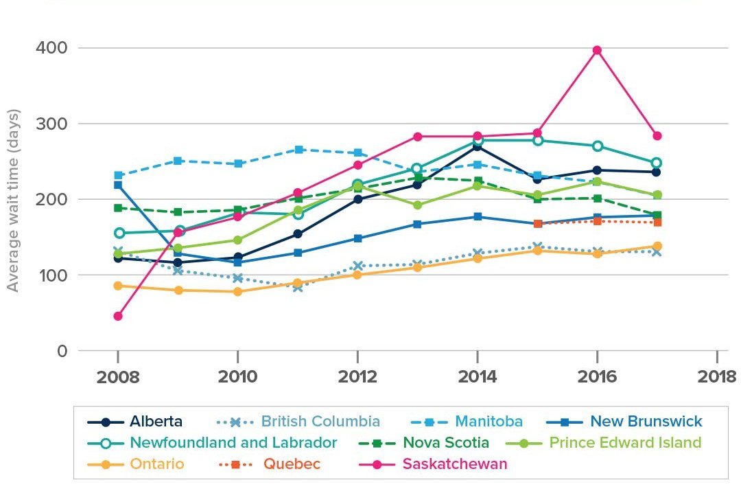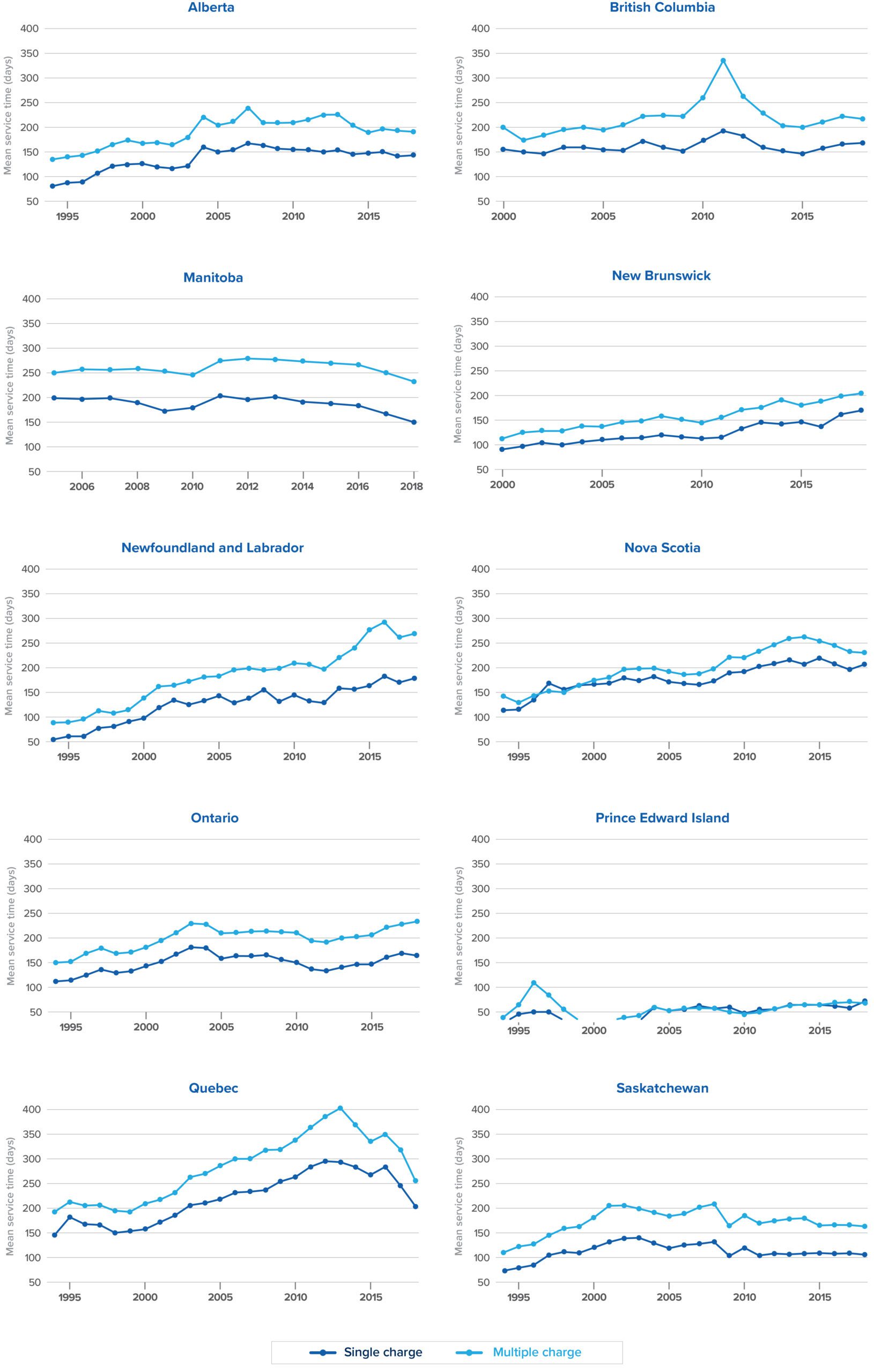 Figure 2 displays Clarke and Metzler’s average time from first appearance to final disposition across nine provinces by single- or multiple-charge cases.[1] The average time from first appearance to final disposition is close to around 200 days in most provinces in 2019, though the increasing trends in most provinces indicate that may change in the future. Based on the modelled distribution of trial durations, this implies that approximately one to six per cent of cases will exceed the Jordan ceiling of 18 or 30 months, or about 3,000 to 20,000 cases initiated each year depending on the percentage of cases that face the 18 or 30 month ceiling. This is close to what has been observed in reality.