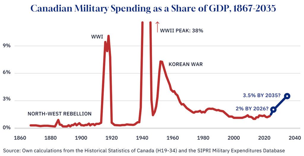 Some historical context may be useful. Drawing from various data sources, I’ve charted Canada’s military spending as a share of GDP since Confederation. For decades, spending was minimal—barely rising above 0.5 percent of GDP, even during events like the North-West Rebellion in the 1880s. That changed dramatically during the First World War, when spending peaked near 10 percent of GDP, and again during the Second World War, when it surpassed one-third of the entire economy.