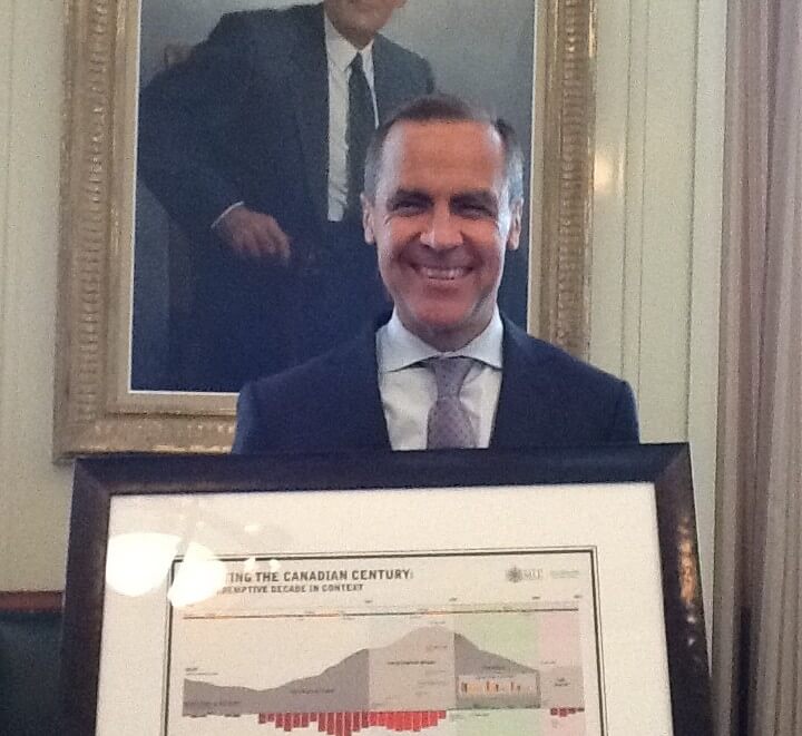 Bank of Canada Governor Mark Carney, who will be leaving at the end of the month to become the Governor of the Bank of England, is a big fan of MLI’s award-winning book, The Canadian Century. As a going away gift we presented him with a framed copy of the infographic which summarises the book’s story, and formed the backbone of the two videos we produced telling the story of Canada’s fiscal reforms to both Canadians and Americans.